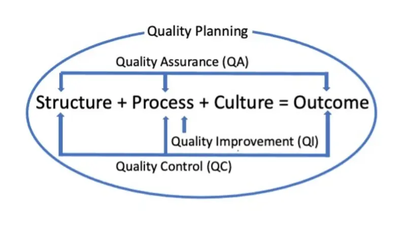 When evidence-based guidance and standards are used as a criterion for measuring care, we can call this quality assurance. We can apply the above S+P+C=O formula to understand what care delivered is actually like by data from structural measures, process measures, and outcome measures (see QA in the diagram).